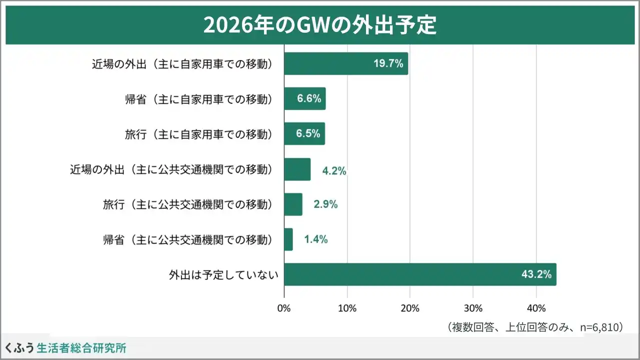 2026年のゴールデンウィークは5月3日~6日が4連休、前後の平日を休めば8~12連休、さらに条件がそろえば16連休という休みの取りやすさが話題ですが、調査時点で外出を予定している人はあまり多くなく、最も多いのが「自家用車で近場の外出」(19.7%)でした。自家用車での帰省や旅行はどちらも約6%に留まっています。約4割が「外出の予定なし」と回答しました。 |