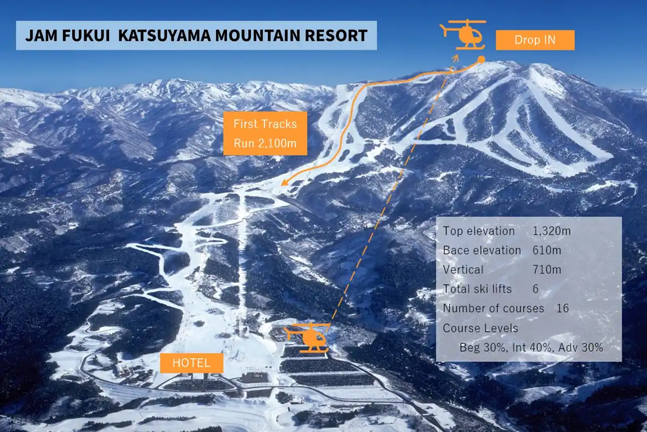 本ツアーは、移動と雪山体験を一体化したラグジュアリーな体験です。ヘリコプターで福井まで快適に移動し、西日本最大級のゲレンデ「JAM福井勝山マウンテンリゾート」の山頂エリア(標高1,320m)へ直行。まだ誰も滑っていない特別なコンディションで、その日最初の滑走を楽しめる“ファーストトラック”を体験できます。1日で非日常と冬の本質的な魅力を味わえるツアーです。 |