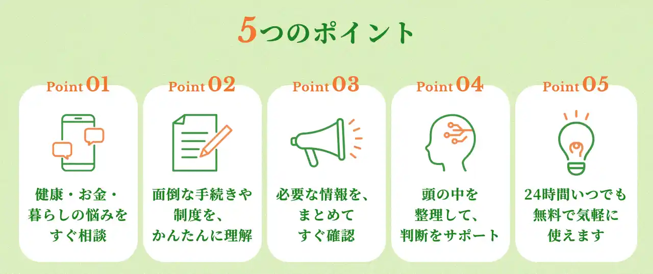 | 食事・健康・お金・暮らしの工夫・制度や手続きなど、日常生活に関わる幅広いテーマに対応し、ユーザーの状況に応じたアドバイスを提供します。 | ||||||||