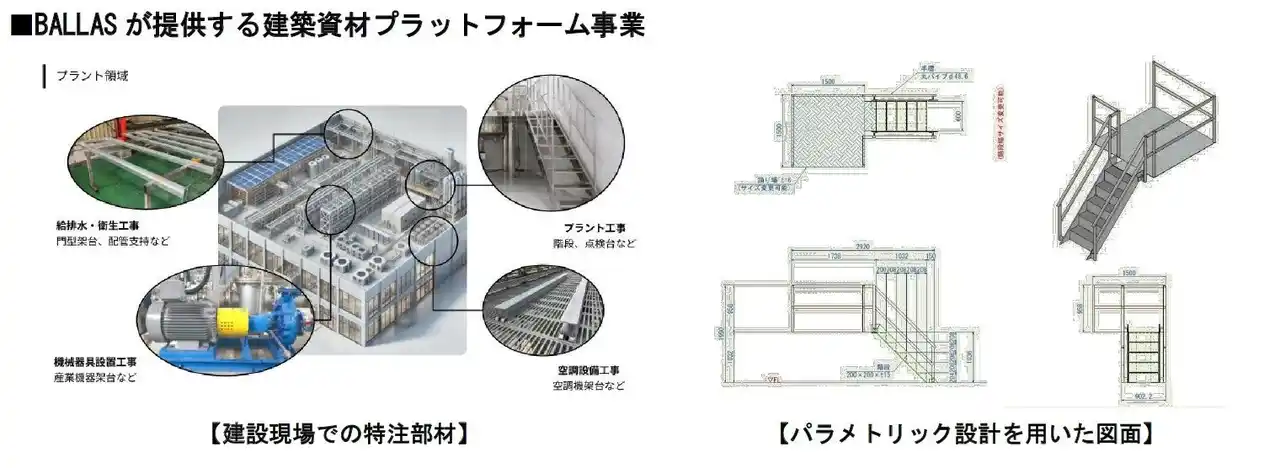 同社はこれらを最適化するプラットフォーム「BALLAS」を顧客および製作会社に提供し、サプライチェーン全体の効率化を目指します。「BALLAS」は、パラメトリック設計(※2)による品質の標準化や、全国150社以上のパートナー企業との連携による見積もり単価のデータベース化、工場の稼働状況を踏まえた最適な製作会社の選定などを通じて、建設部材調達の高度化を実現しています。大和ハウスグループはBALLASへの出資及び事業共創を通じて、建設領域の工業化技術の高度化とDXを推進し、持続可能なまちづくりの実現に貢献してまいります。 |