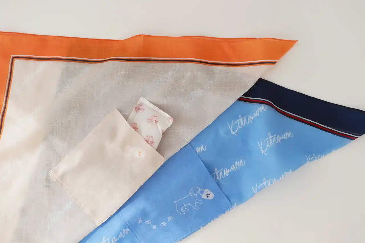 見た目は上品でシンプルなネッカチーフ。しかし実は、内側に保冷剤を収納できるポケットを備えた、機能性ハンカチです。 |