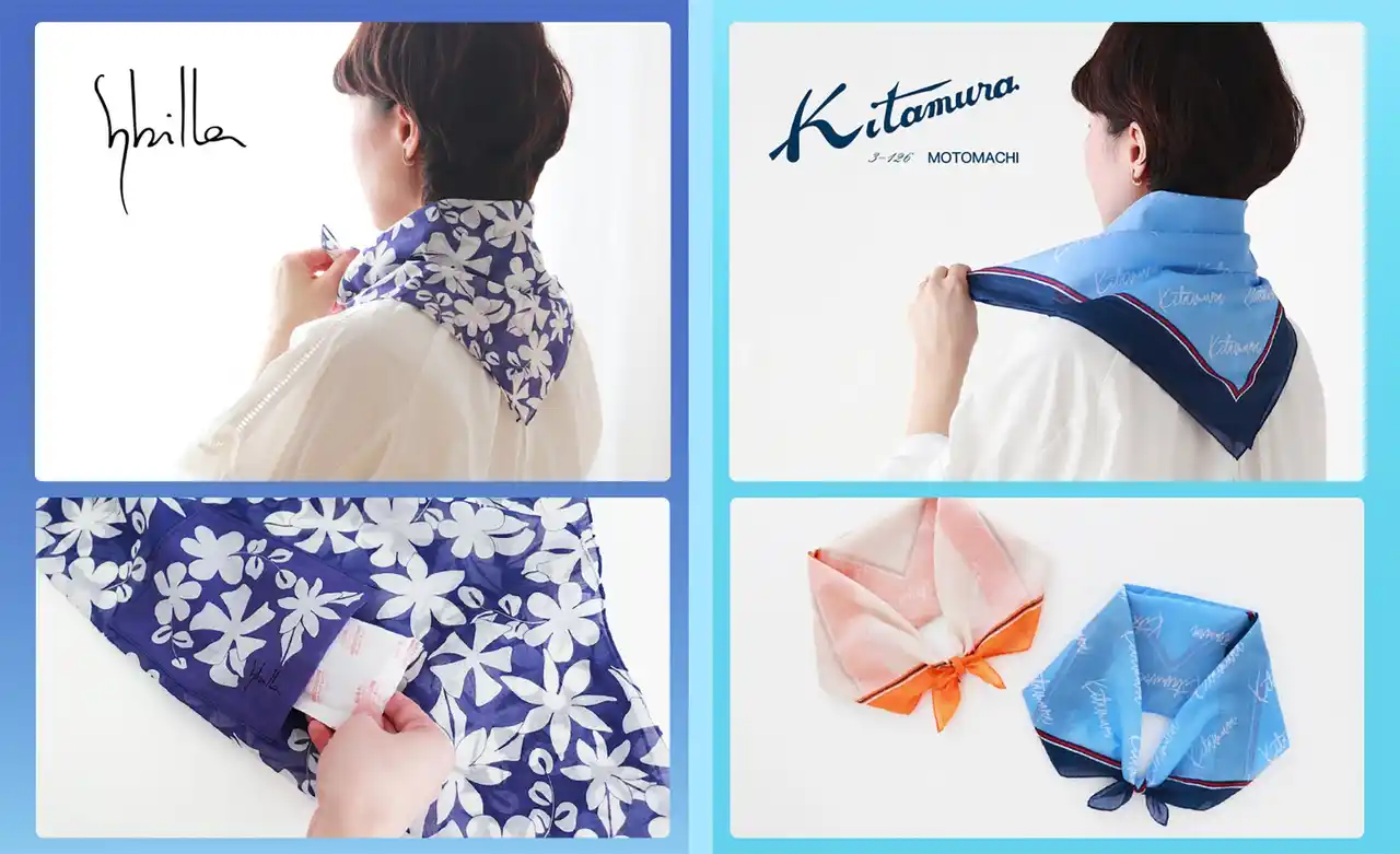 1879年(明治12年)創業のブルーミング中西株式会社(本社 東京都中央区 取締役社長 中西一)はスペインのブランド「Sybilla(シビラ)」と横浜元町のハンドバッグブランド「キタムラ」より、猛暑対策として、「保冷剤を入れられるポケット付き大判ハンカチーフ」を発売いたします。 |