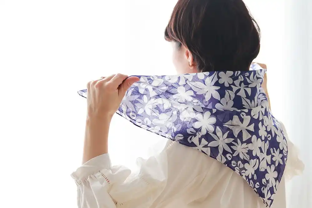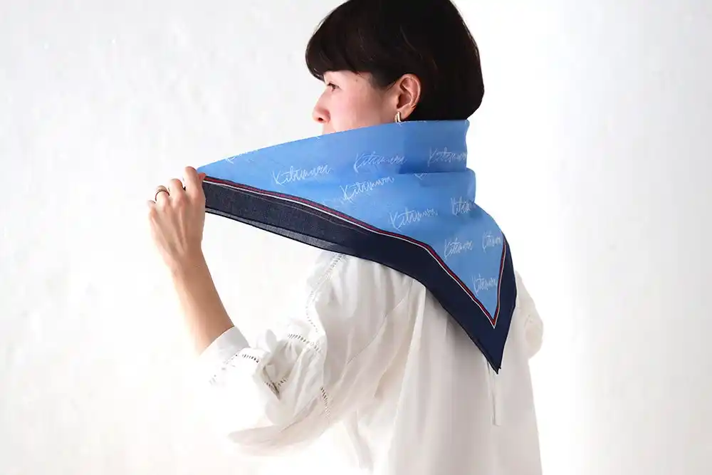 首元に巻いたり、肩に掛けたりと、通常のネッカチーフと同じように使用でき、装いに自然に溶け込みながら、さりげなく猛暑対策が可能です。 |