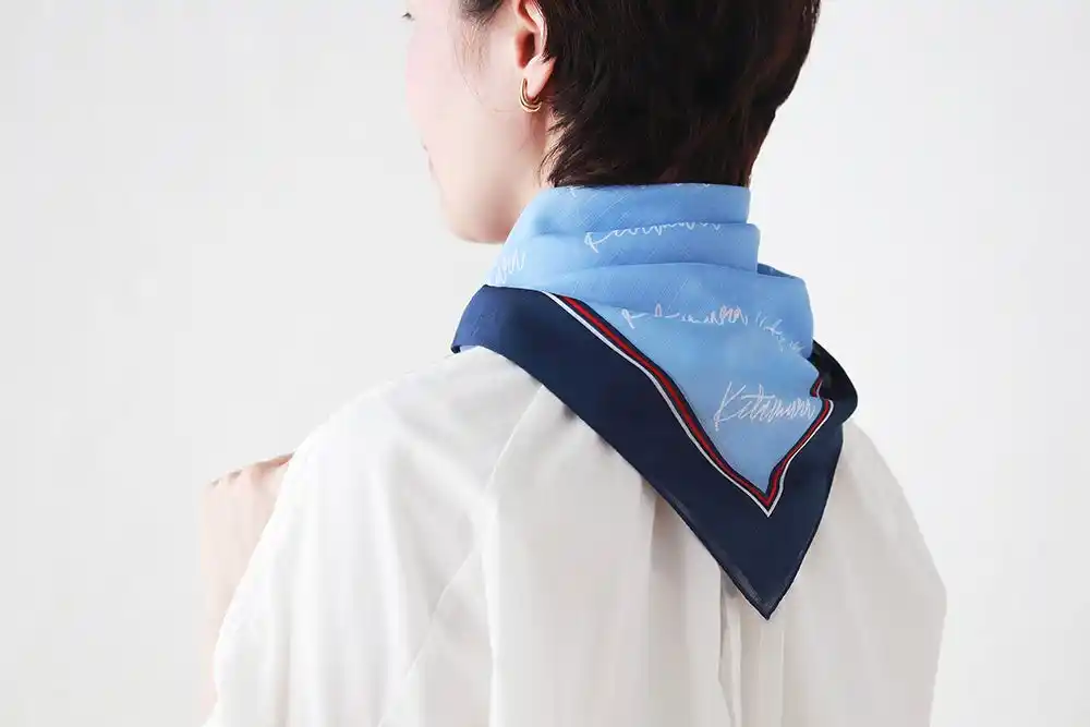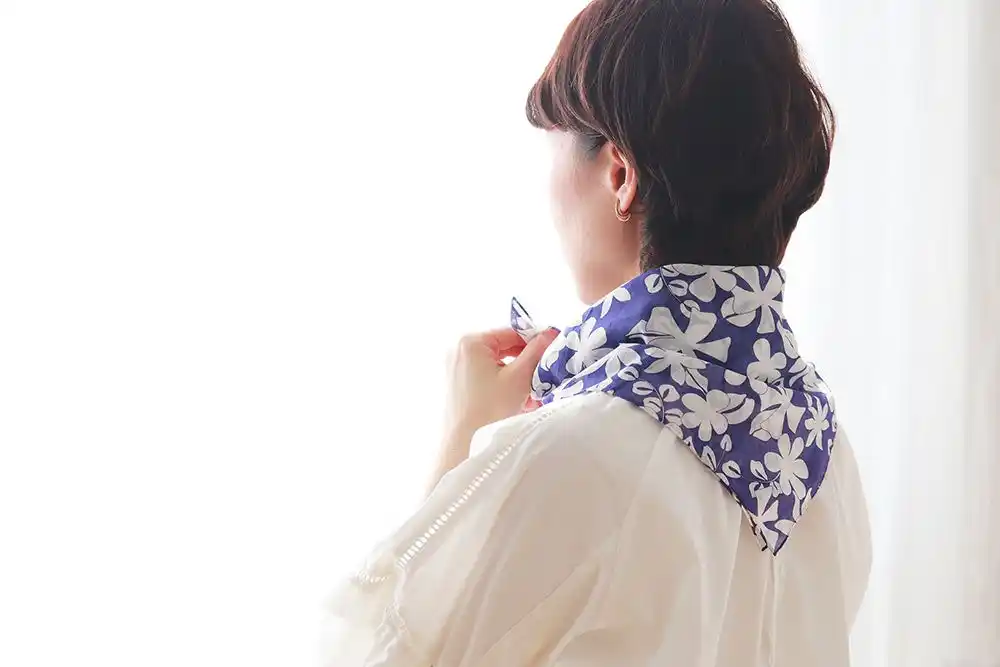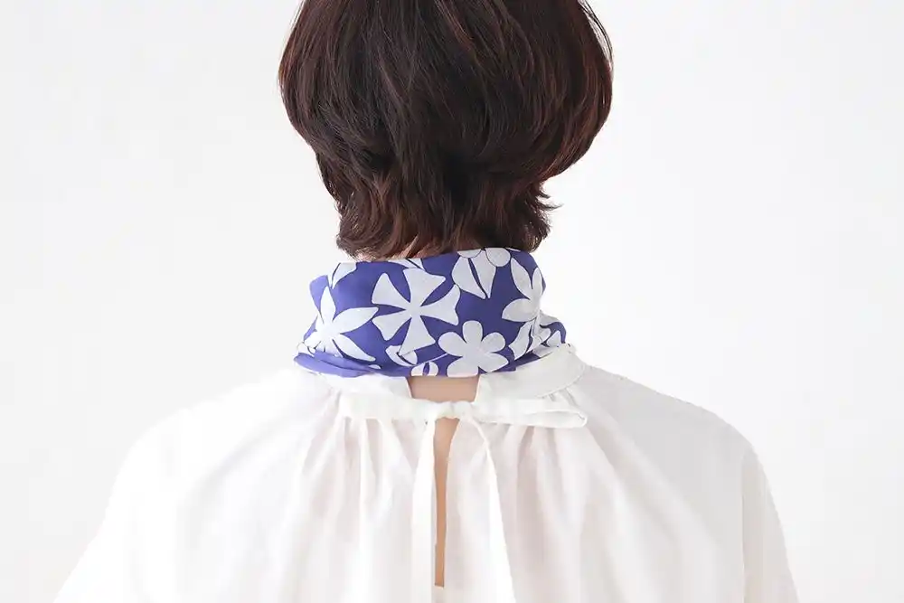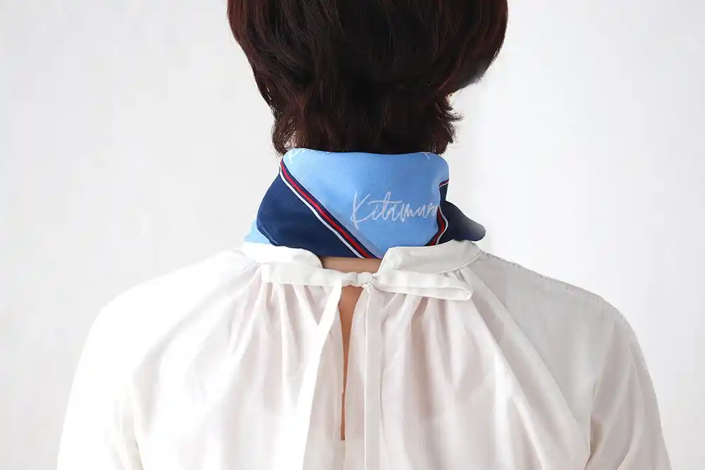 斜め半分に折って首に巻く仕様のため、ポケット部分は外から見えにくい設計。見た目はあくまで上品なネッカチーフのまま、自然に暑さ対策が可能です。 |