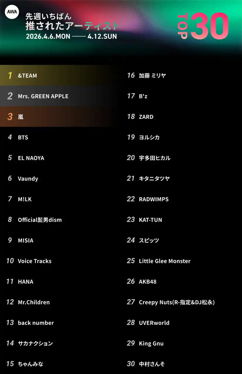 【AWA】 【先週いちばん推されたアーティストTOP30】&TEAM、Mrs. GREEN APPLE、嵐らが上位に