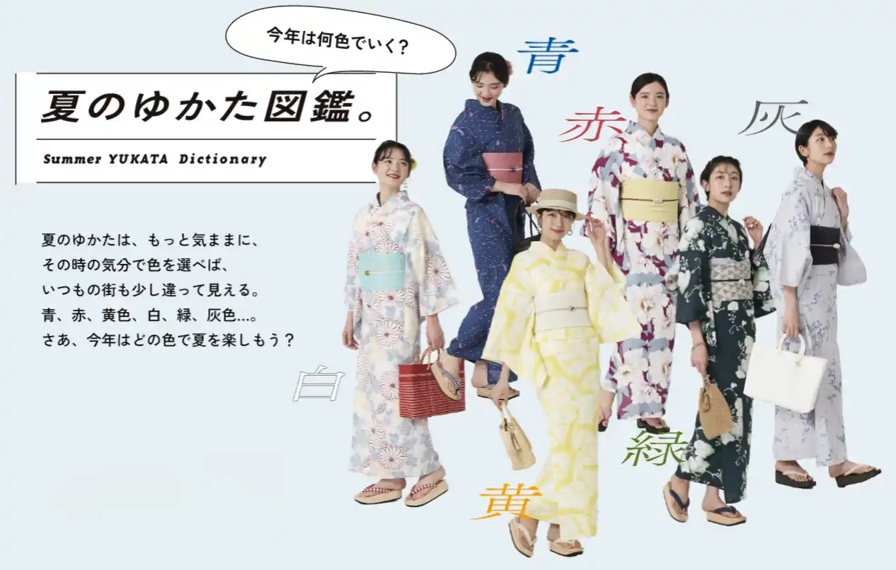 さらに、「夏のゆかた図鑑」として色別コーディネートも展開。「風花」「爽々ゆかた」「メンズゆかた」など、今年の新作を中心に多彩な着こなしをご紹介します。 |
