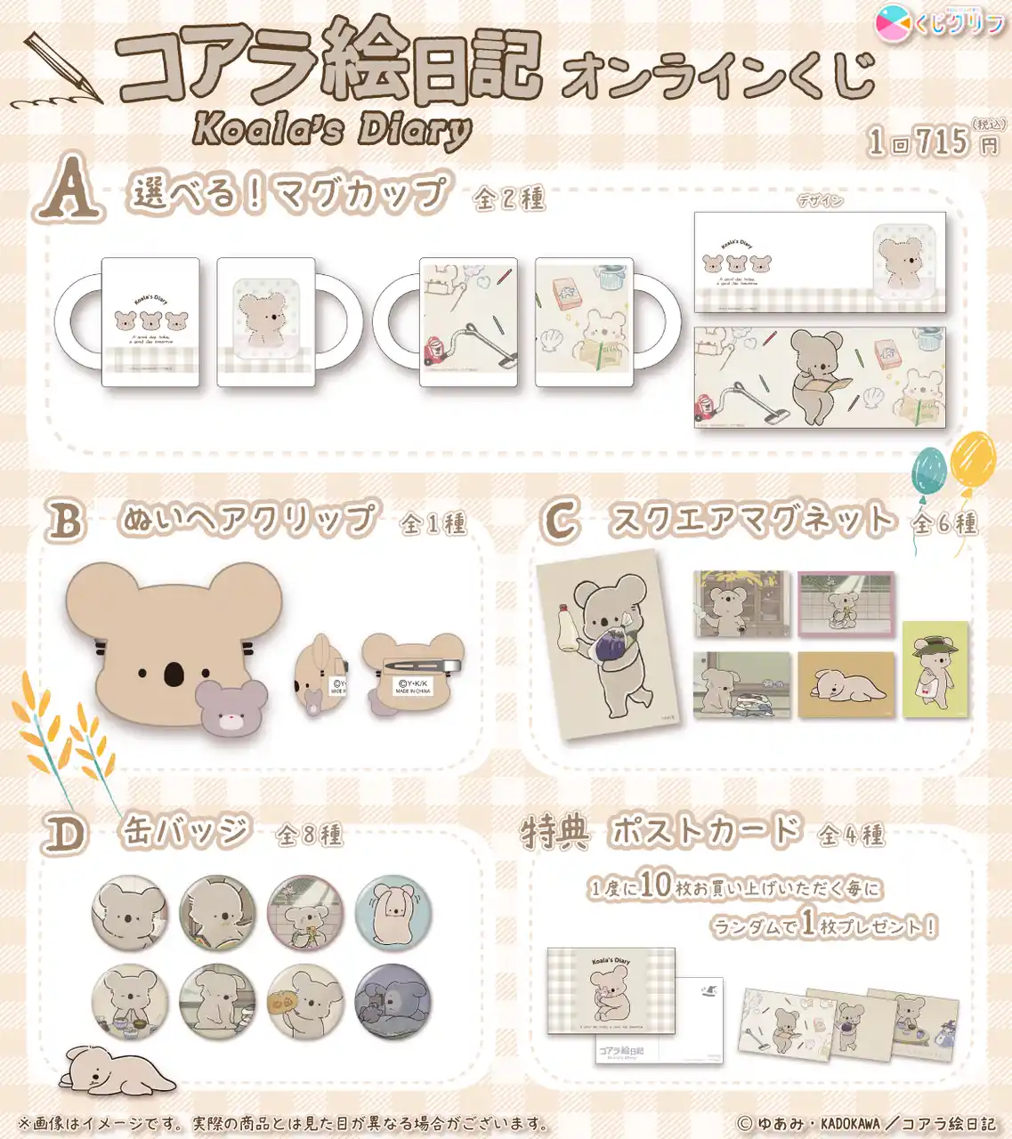 | 株式会社サトクリフ(本社:東京都千代田区、代表取締役社長:加藤 勝)は、運営するオンラインくじサービス「くじクリフ」より、アニメ『コアラ絵日記』のオンラインくじを2026年4月15日(水)10:00より販売いたします。 | |||||||||||||||||||