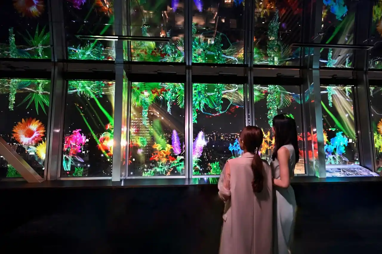 今回は、窓面全体に広がる360°のプロジェクションマッピングに加え、スカイデッキの空間全体を爽やかな初夏の装いへと一新。ひまわりをはじめ、ダリアや花菖蒲など、夏を象徴する色とりどりの花々が咲き誇り、やがて窓一面に広がる花畑へと移り変わるマッピングショーが、名古屋の夜景を華やかに彩ります。 |