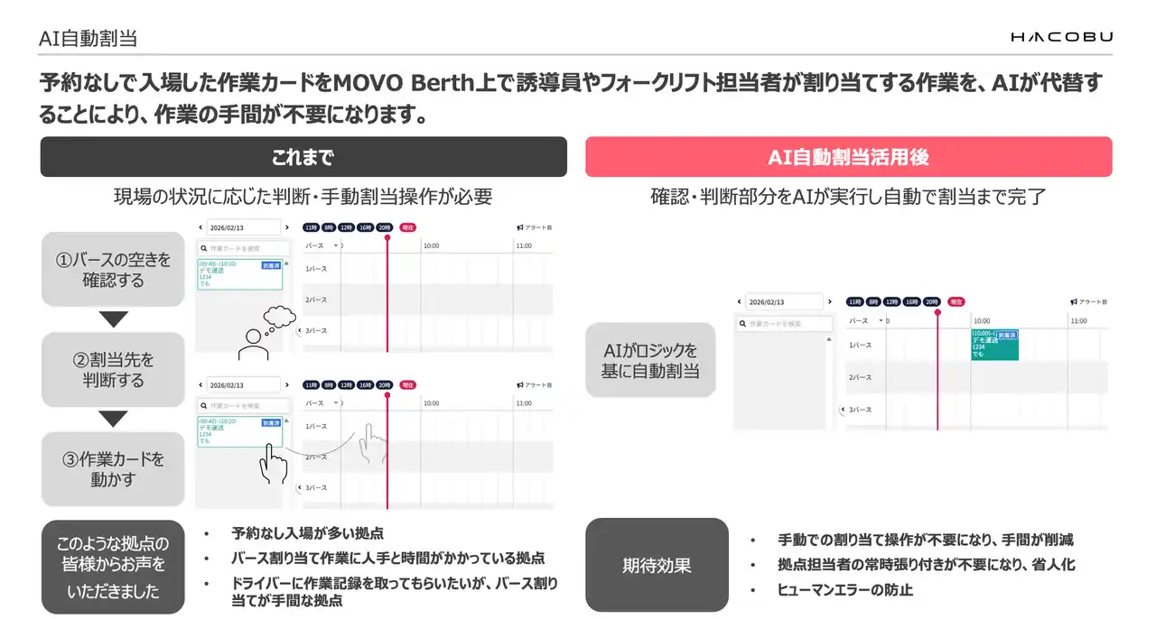 Hacobuは、AI技術も活用しながら、MOVO Berthにおける自動化機能をさらに拡充し、物流拠点の効率化を推進してまいります。運用データを活用した割り当て精度の向上などを通じ、物流現場の生産性向上に貢献してまいります。 |
