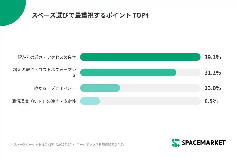 スペースを探す際に最も重視するポイントは「駅からの近さ・アクセスの良さ」(39.1%)が1位、次いで「料金の安さ・コストパフォーマンス」(31.2%)となりました。移動効率を最大化できる立地にあることが、ワークボックス選びの最大の基準となっています。また、Wi-Fi環境(6.5%)についても4位にあがっており、速度品質も重視されていることがわかります。 |