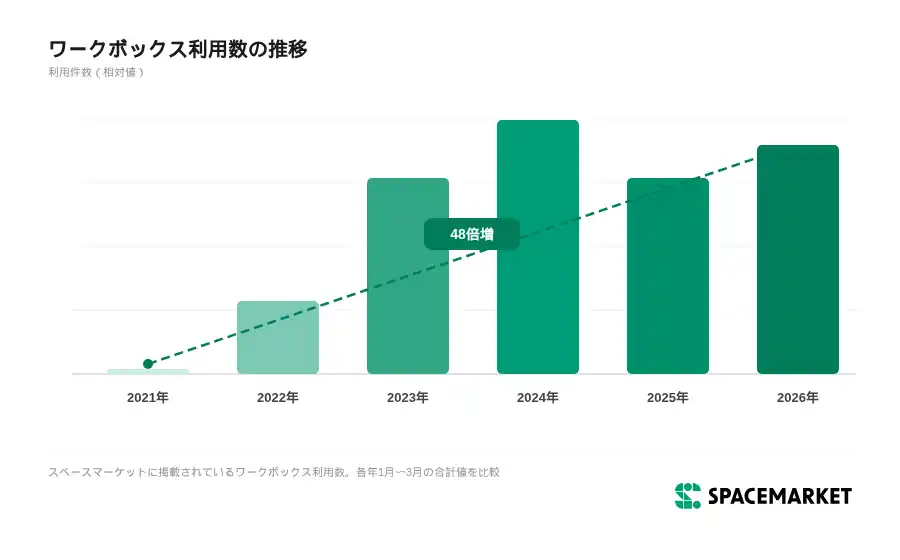 (※1)スペースマーケットに掲載されているワークボックス利用数、2021年1月~3月と2026年1月~3月の合計値比較データ。 |