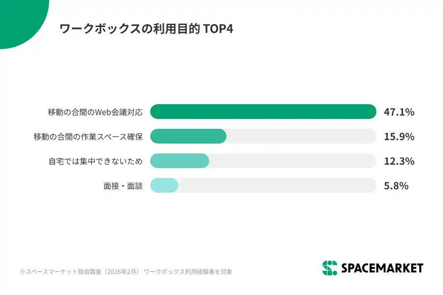利用目的の47.1%が「移動時間の間にWeb会議が入り、オンラインで話せる場所が必要だった」と回答。外出先や移動中に、周囲の目を気にせず安定した通信環境でWeb会議や商談を行うセーフティネットとして機能していることがわかりました。また「移動の合間」需要以外にも、自宅に家族がいて集中できない場合(12.3%)や、採用面接・転職面談など秘匿性が高い用途(5.8%)での利用も確認されています。 |