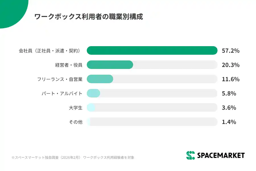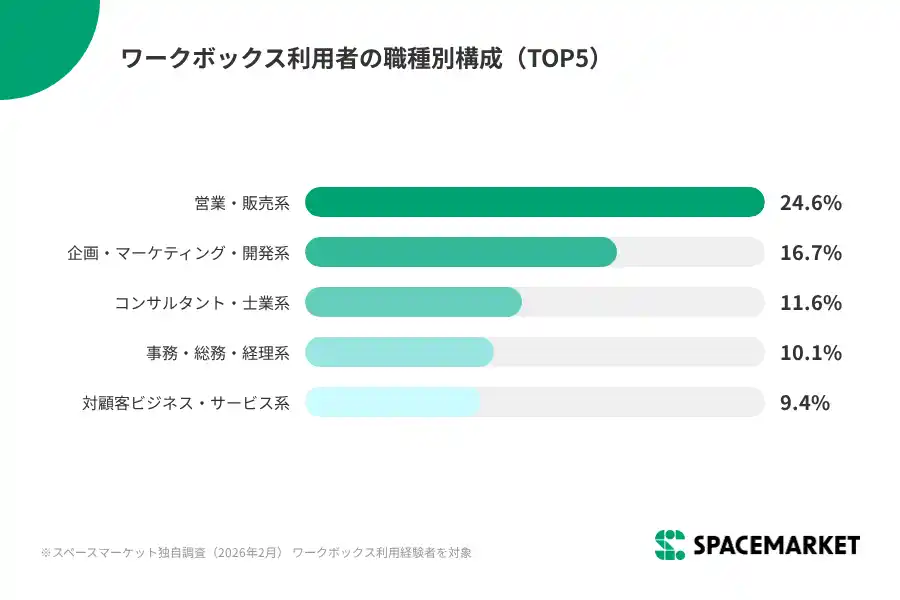 ワークボックス利用者の職業は、会社員(正社員・派遣・契約社員)が約57%を占め、経営者・役員を含めると約77.5%が組織に属しています。職種別では営業・販売系(24.6%)が最も多く、外出や打ち合わせが多い職種に支持されています。一方で、大学生の利用もあり、就職活動における面談・面接の場としても活用が広がっています。 |