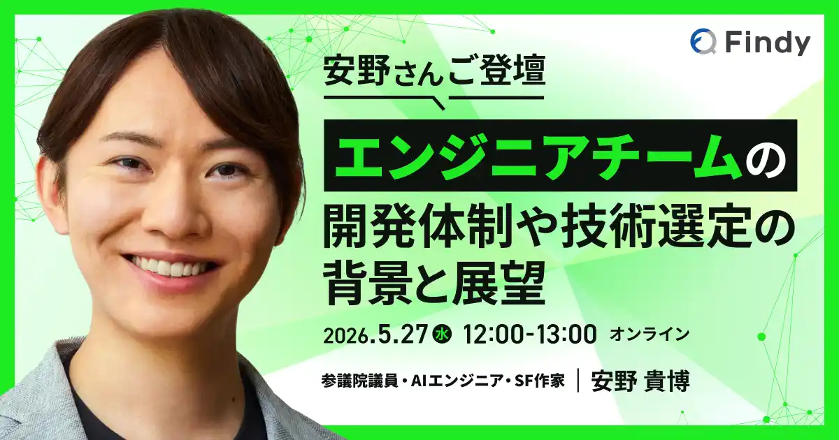 エンジニアプラットフォームを提供するファインディ株式会社(東京都品川区、代表取締役:山田 裕一朗、以下「当社」)は、2026年5月27日(水)に開催するオンラインイベントの参加申し込み受付を、本日より開始したことを発表します。本イベントは、チームみらい党首であり参議院議員の安野 貴博氏をお招きし、エンジニアチームの開発体制や技術選定の背景と展望をお話しいただきます。 |