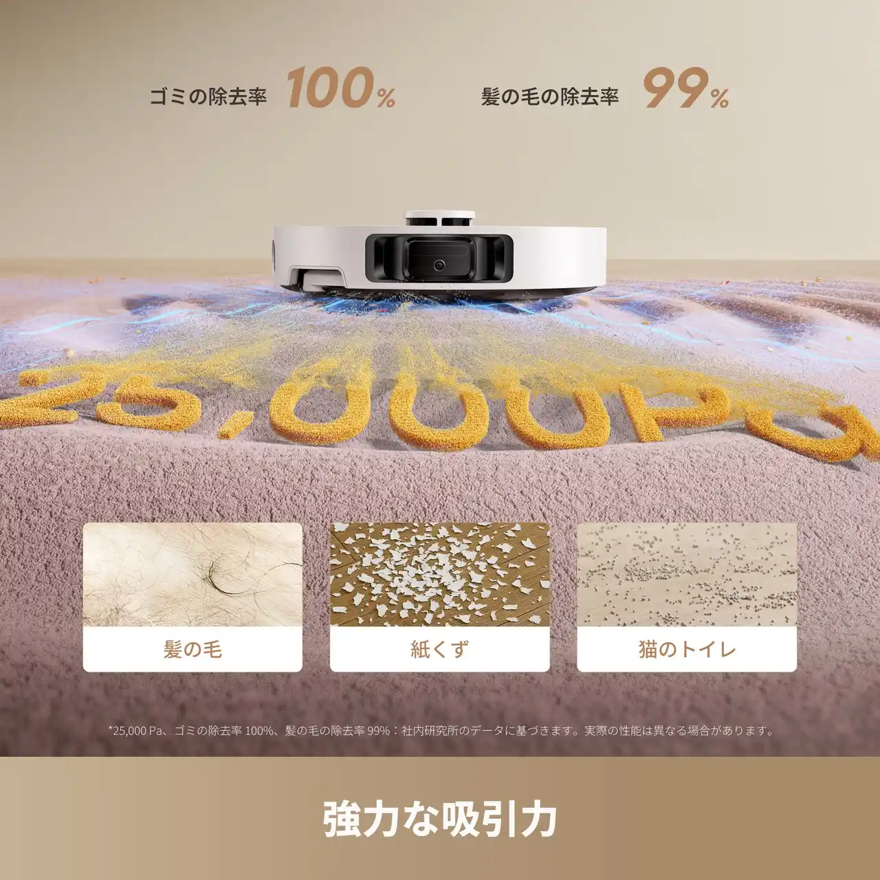 第6世代 TurboForceモーターによる25,000Pa[*1]のVormax吸引で、髪の毛やホコリ、猫砂までしっかり吸引し、ゴミ除去率99%・髪の毛除去率99%を実現します。 |