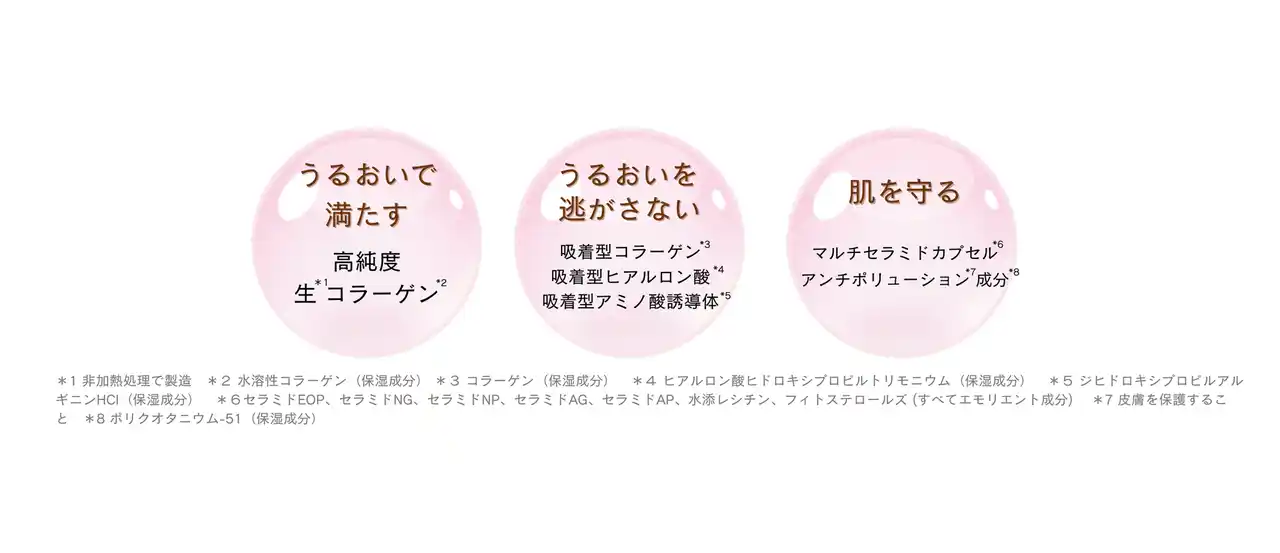 ※1 保湿成分 ※2 年齢に応じたお手入れ ※3 パパイン(保湿成分) ※4 ココイル加水分解コラーゲンK(洗浄成分) ※5 精製水含む ※6 非加熱処理で製造 ※7 水溶性コラーゲン(保湿成分) ※8 皮膚を保護すること ※9 ポリクオタニウム-51(保湿成分) ※10 エモリエント成分 ※11 セラミドEOP、セラミドNG、セラミドNP、セラミドAG、セラミドAP、水添レシチン、フィトステロールズ (すべてエモリエント成分) ※12 角質層まで ※13