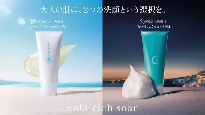 キューサイ株式会社(本社:福岡市中央区、代表取締役社長:石川 順朗)は、20年以上のコラーゲン(※1)研究知見を活かし、2025年4月に誕生した「cola・rich soar(コラリッチ ソア)」シリーズより、朝と夜の肌環境に合わせた朝用洗顔・夜用洗顔の2品を、2026年4月15日(水)に発売いたします。「朝は時短ジェル洗顔で、寝起きの肌を素早く整え化粧ノリのいい肌へ」「夜は濃密泡洗顔で、本格エイジングケア※2をしながらもっちりとした肌へ」、洗顔で朝と夜のなりたい肌に整える新習慣をお届けします。 |