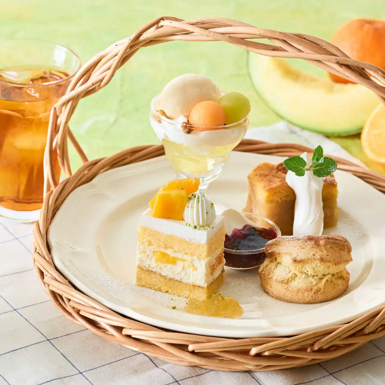 ふわふわのスポンジにオレンジホイップをサンドし、オレンジとマンゴーをトッピング。すっきりとした味わいのジャスミンティーゼリーを添えて。 |