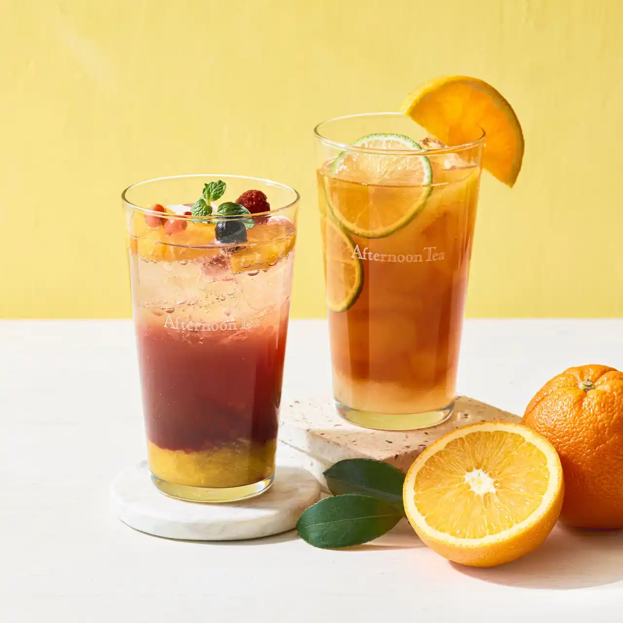 なかでも注目は、オレンジアールグレイの香り豊かなアイスティーを使った2種類の新作アレンジティー。「フルーツエードティー オレンジ&ライム」は、オレンジ果肉、ぷるぷる食感のジャスミンティーゼリー、キリっとした酸味のライムで爽やかに。「オレンジとカシスのティーソーダ」は、オレンジ果肉、ミックスベリー、甘酸っぱいカシスソースでシュワっと大人の味わいに仕上げています。 |