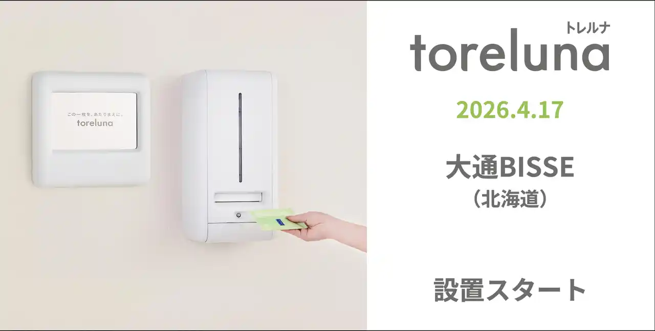 株式会社ネクイノ(大阪市北区、代表取締役:石井 健一)は、トイレの個室で生理用ナプキンを常備し無料で提供するサービス「toreluna(トレルナ)」(以下 トレルナ)を、大通BISSEへ設置し、サービスの提供を開始いたします。 |