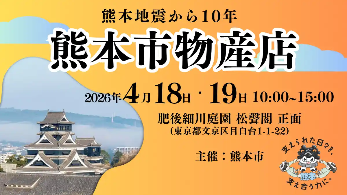 熊本市(市長:大西 一史)は、令和8年(2026年)4月18日(土)・19日(日)の2日間、東京都文京区目白台にある肥後細川庭園にて、熊本地震から10年の節目とした企画『熊本市物産店』を開催いたします。平成28年(2016年)熊本地震から10年、全国の皆さまの支援により、熊本は力強く復興いたしました。この経験と教訓や熊本と文京区の歴史や文化の繋がりを伝えるパネル展をはじめ、熊本市が誇るうまかもん(特産品)の販売を実施いたします。 |