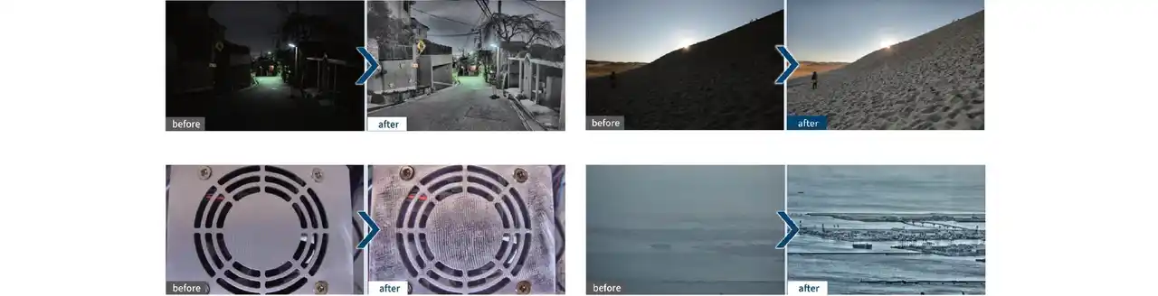 国内で開発された独自のアルゴリズムにより、「より鮮明」かつ「リアルタイム処理(遅延 0.004 秒以内)」を実現。明暗が混在する場面や極端な低照度環境下、雨・霧・雪などで不明瞭になった映像に対し、特に効果的な鮮明化を提供します。 |