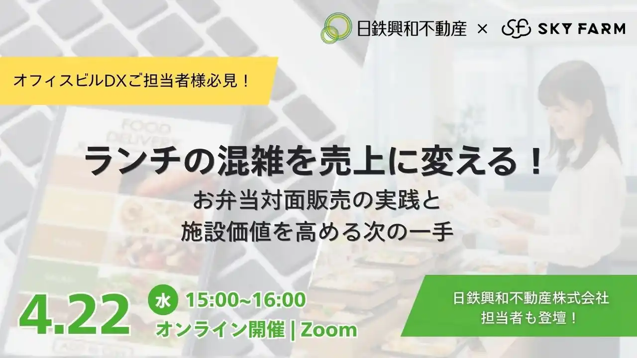 商業施設・オフィスビルに共通する「ランチ混雑」「空きスペースの活用」といった課題に対し、スカイファームが現場に入り実践してきたお弁当対面販売の取り組みをご紹介します。「TORANOMON MARCHE」を運営する日鉄興和不動産株式会社のご担当者様とのトークセッションでは、現場での実践事例を具体的にお伝えします。さらに、モバイルオーダーや提携サービスを活用した施設価値向上の考え方など、施設の活性化・収益改善を検討されているご担当者様にとってすぐにお役立ていただける内容をお届けします。 |