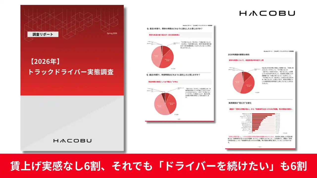 データの力で物流課題を解決する株式会社Hacobuは3月、全国のトラックドライバー1,516名を対象に「【2026年】トラックドライバー実態調査」を実施しました。 本調査では、6割以上のドライバーが「賃金が上がった実感がない」と回答しました。働き方改革の影響で労働時間や残業が減少した結果、約2割のドライバーは賃金も減少しており、収入面での課題が明らかになりました。運賃の価格転嫁が十分に進んでいないなど、業界全体の構造的な要因があると考えられます。 一方で、仕事を続けたいと考えるドライバーは6割以上にのぼり、安定的な人材確保に向けて、賃金を含む働く環境の見直しが求められます。 |