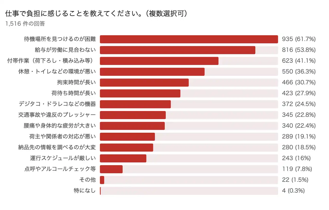 荷待ちが数年来話題でしたが、仕事で負担に感じることは、「待機場所を見つけるのが困難(61.7%)」が最多でした。次いで「給与が労働に見合わない(53.8%)」「付帯作業(荷下ろし・積み込み等)(41.1%)」が続きました。 |