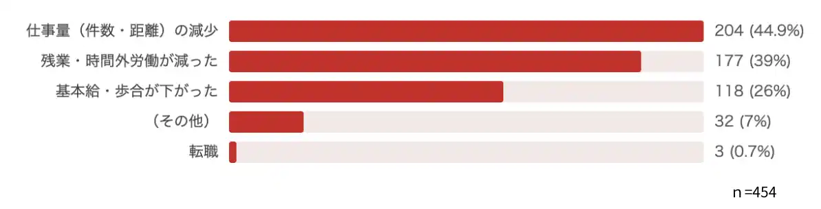 「変わらない(50.5%)」が過半数を占め、拘束時間の体感としては“横ばい”が中心であることが分かりました。一方で「やや短くなった(36.9%)」も4割近くに上り、働き方改革の影響が現場の実感として表れ始めています。 |