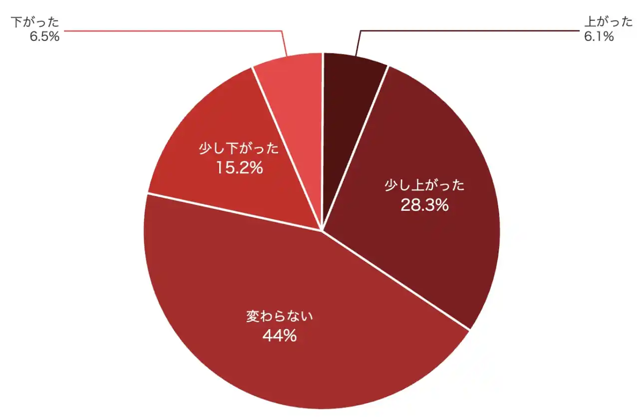 「変わらない(44%)」、「少し下がった(15.2%)」、「下がった(6.5%)」の合計が6割以上で、賃金が上がった実感を持てない層が中心となりました。 |