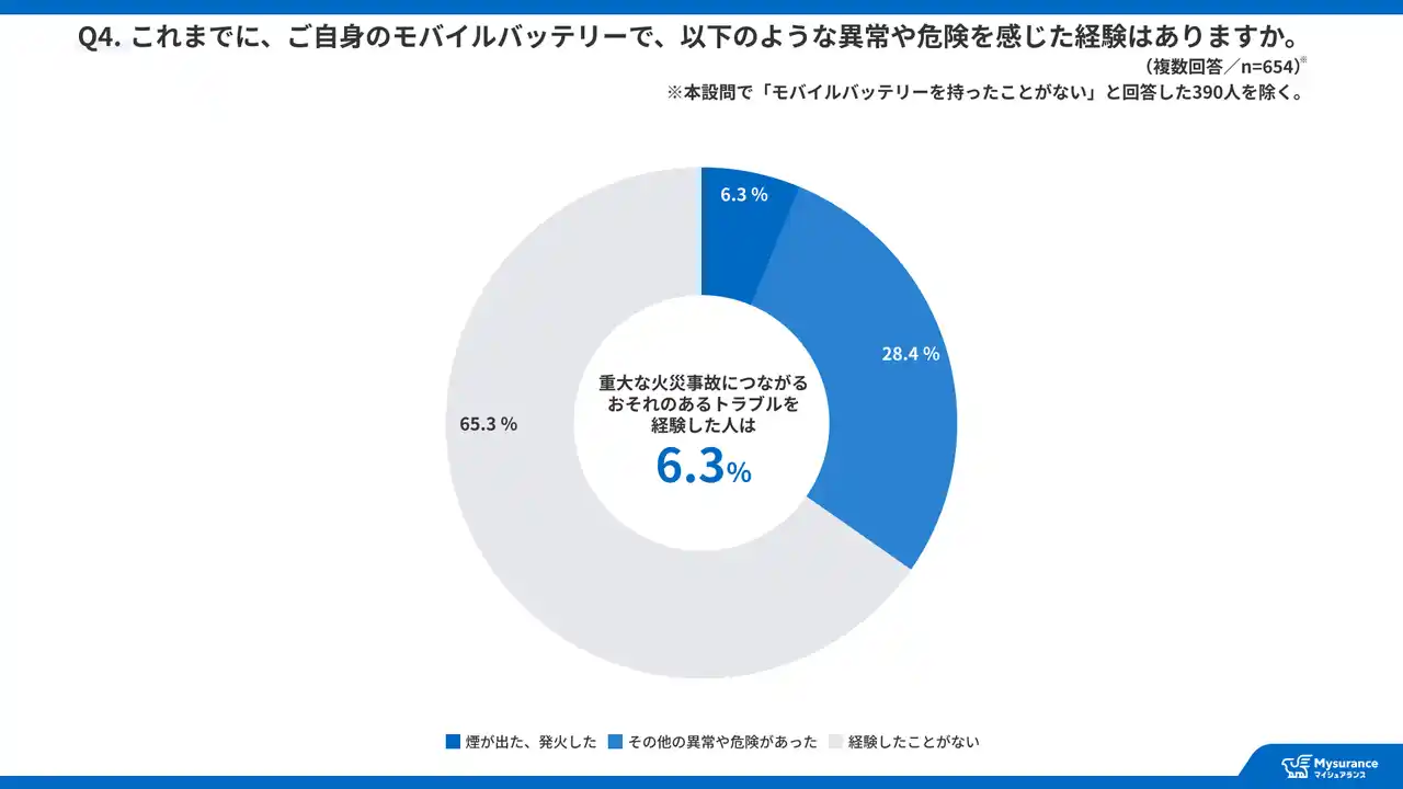 モバイルバッテリーの使用において異常や危険を「経験したことがない」と回答した人は65.3%となる一方で、その他の異常や危険(「異常に熱くなった」「膨張した」「焦げたようなにおいがした」「充電中に異音がした」)を経験した人も28.4%存在したほか、「煙が出た」「発火した」といった発煙・発火などの重大な火災事故につながるおそれのあるトラブルを経験した人は6.3%確認されました。 |