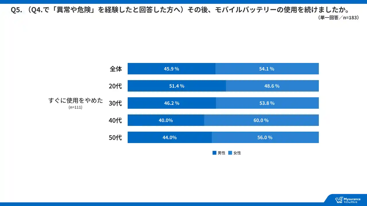 一方、「すぐに使用をやめた」と回答した割合を男女で比較すると、男性は45.9%に対し、女性は54.1%でした。属性によって行動に差が見られる点も特徴的です。 |