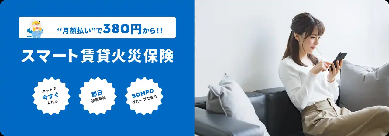 Mysuranceでは、賃貸住宅に必要な「借家人賠償(大家さんへの賠償)」や「家財の補償」、「個人賠償責任保険※(1億円まで補償)」等がセットされた、「スマート賃貸火災保険」を提供しています。詳しくは、Webサイトをご確認ください。 |