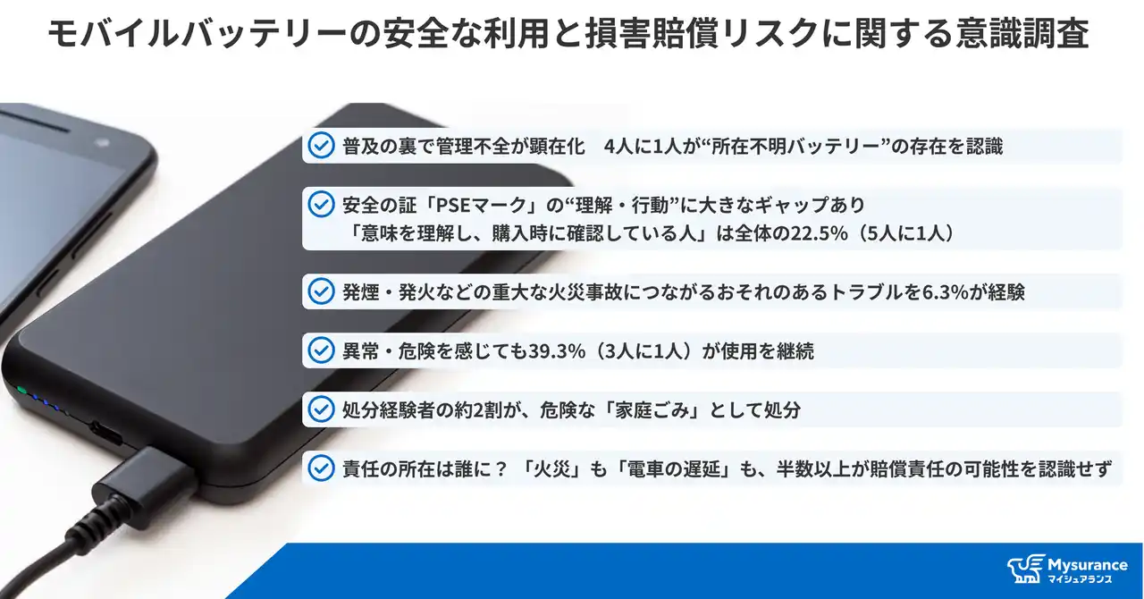 損害保険ジャパン株式会社(本社:東京都新宿区、代表取締役社長:石川 耕治、以下「損保ジャパン」)の子会社で少額短期保険業を営むMysurance(マイシュアランス)株式会社(本社:東京都新宿区、代表取締役社長:清水 廣臣、以下「Mysurance」)は、全国の賃貸住宅にお住まいの20歳~59歳の男女1,000名を対象に、「モバイルバッテリーの安全な利用と損害賠償リスクに関する意識調査」を実施しました。 |