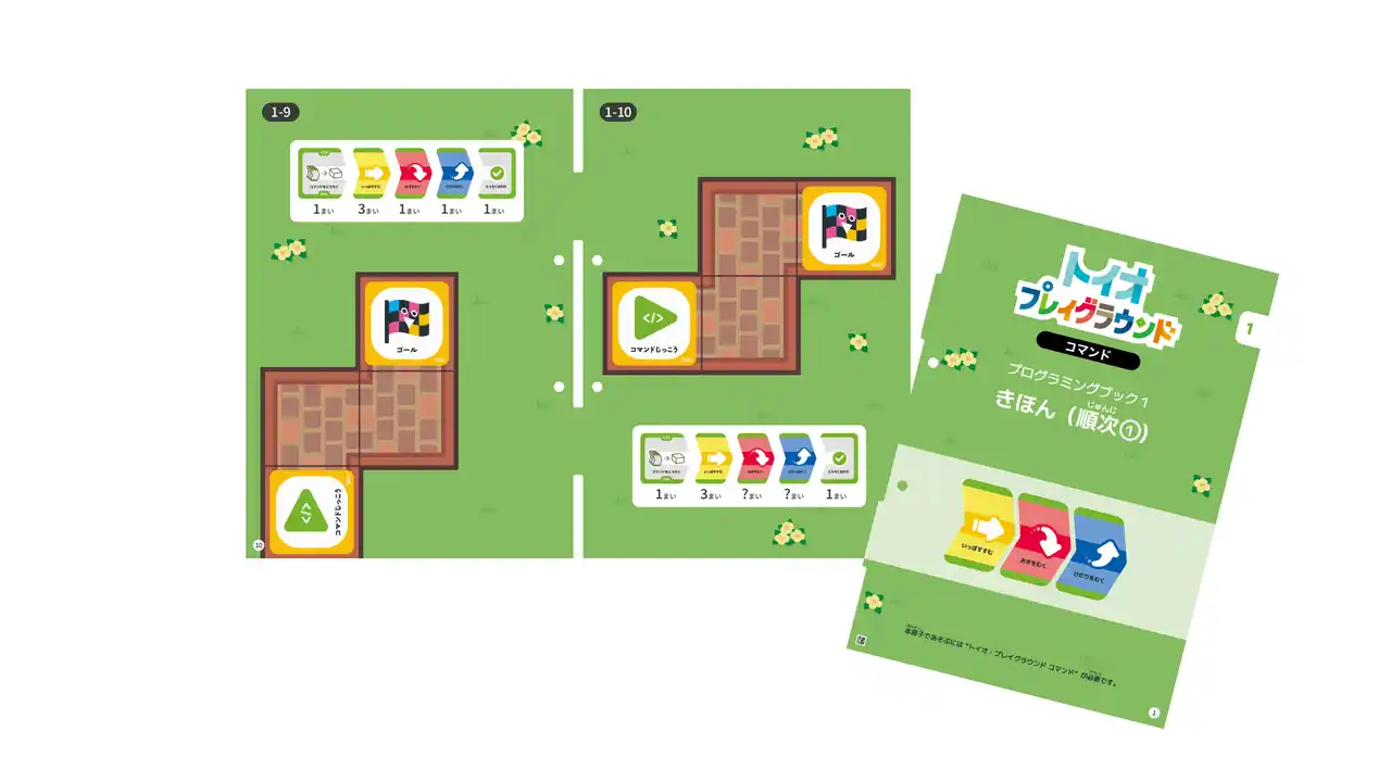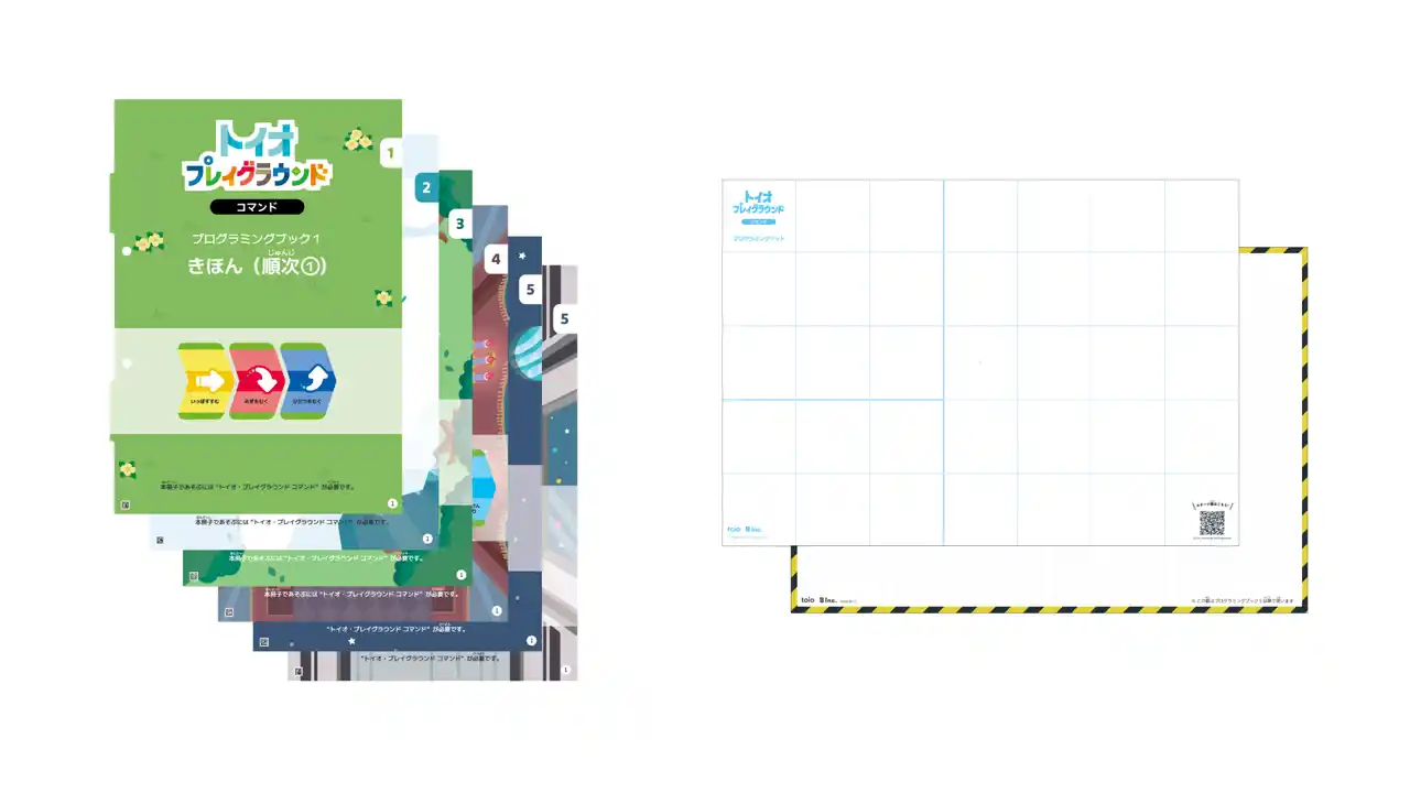 プログラミングブックとは、文部科学省のガイドライン「小学校プログラミング教育の手引(第三版)」に準拠したトイオ・プレイグラウンド コマンド専用の問題集です。 |