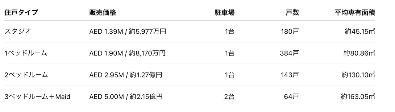 Yas Park Placeは、単身層からファミリー層まで幅広いニーズに対応する住戸構成を備えた、総戸数780戸の新規プロジェクトです。販売価格はAED 1.39M~(約5,977万円~)、完成は2030年4月頃を予定しています。住戸構成および支払いプランは以下の通りです。 |