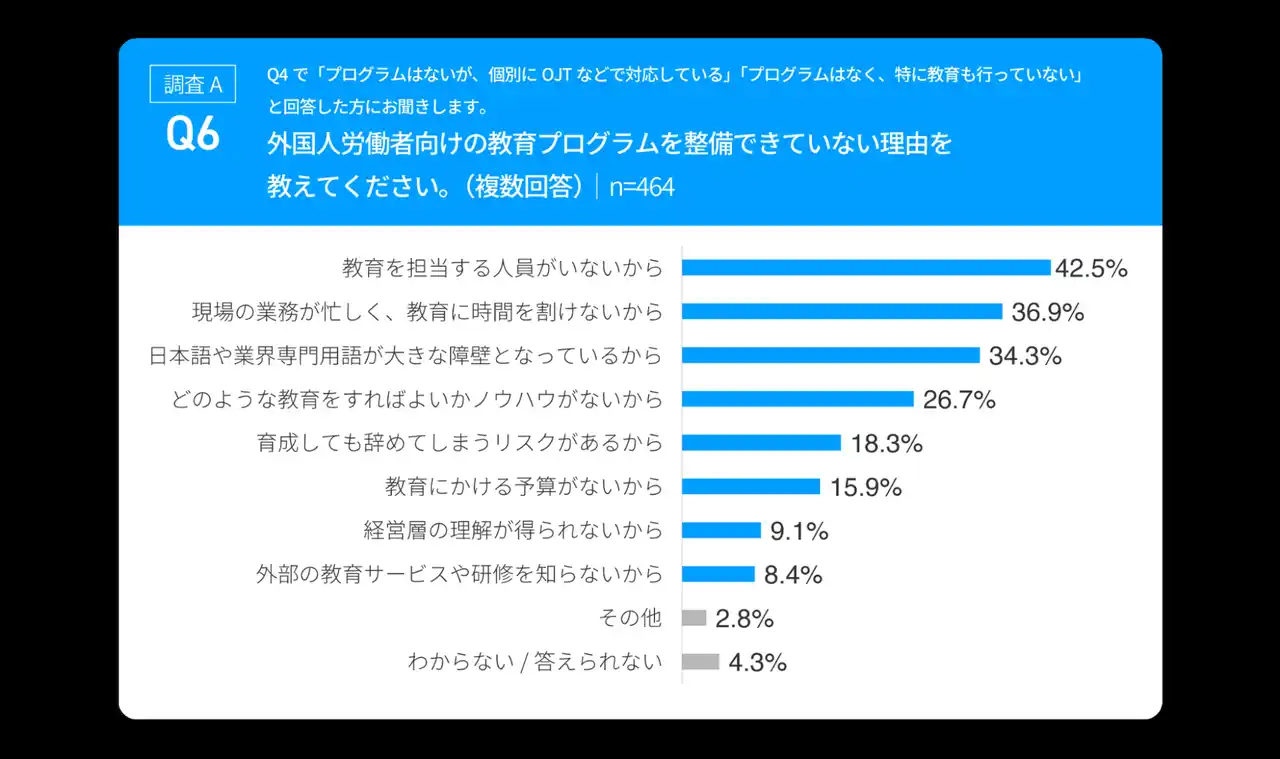 教育プログラムを十分に整備できていないと回答した企業にその理由を尋ねたところ、「教育を担当する人員がいない」(42.5%)が最多、次いで「現場の業務が忙しく、教育に時間を割けない」(36.9%)、「日本語や業界専門用語が大きな障壁となっている」(34.3%)が続きました。 |