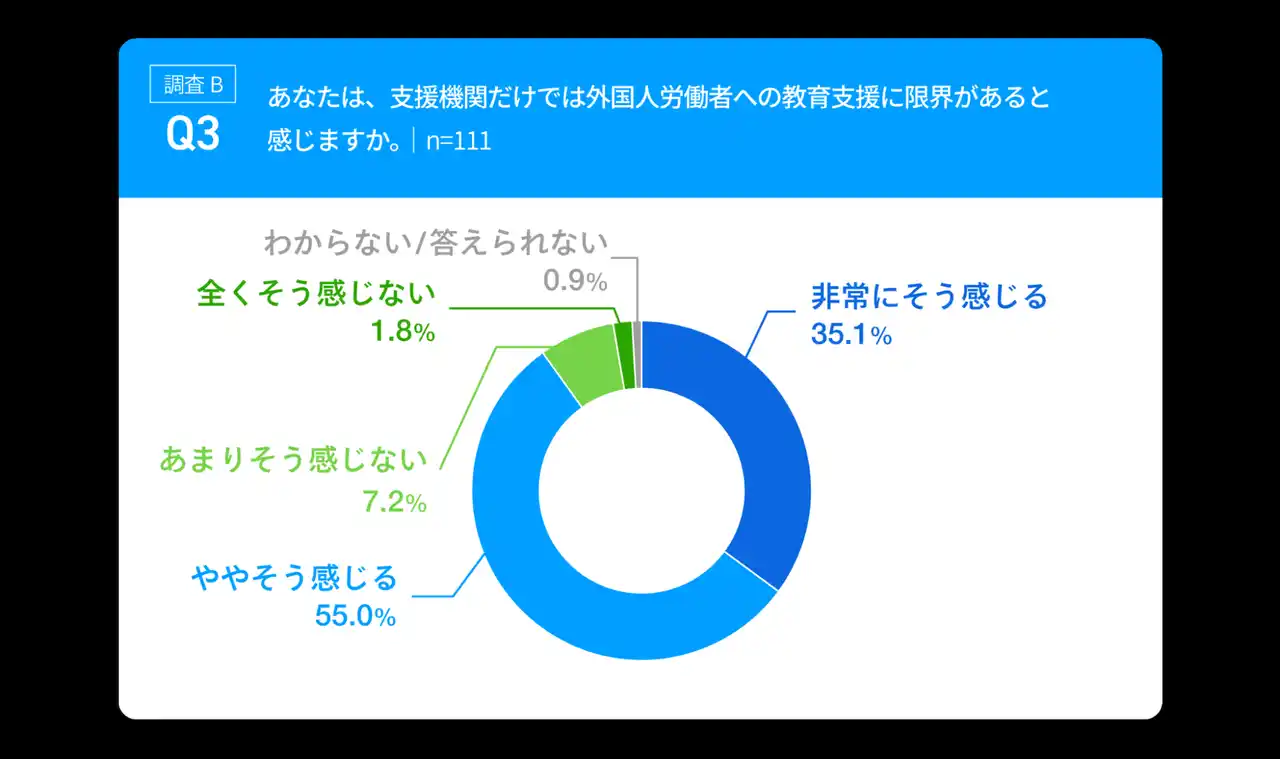 さらに、支援機関だけでは外国人労働者の教育支援に限界があると感じるかという問いに対し、「非常にそう感じる」(35.1%)と「ややそう感じる」(55.0%)を合わせて90.1%が限界を感じていると回答しました。 |