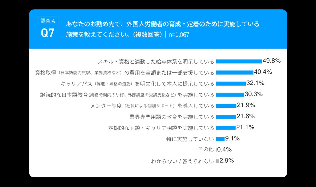 雇用企業が外国人労働者の育成・定着のために実際に実施している施策について尋ねたところ、「スキル・資格と連動した給与体系を明示している」(49.8%)が最多で、「資格取得(日本語能力試験、業界資格など)の費用を全額または一部支援している」(40.4%)、「キャリアパス(昇進・昇格の道筋)を明文化して本人に提示している」(32.1%)が続きました。 |