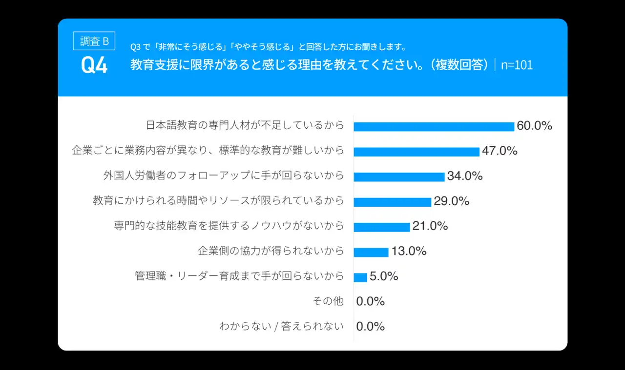 教育支援に限界を感じている支援機関に対し、その具体的な理由を尋ねたところ、「日本語教育の専門人材が不足しているから」(60.0%)が最多で、「企業ごとに業務内容が異なり、標準的な教育が難しいから」(47.0%)、「外国人労働者のフォローアップに手が回らないから」(34.0%)が続きました。 |