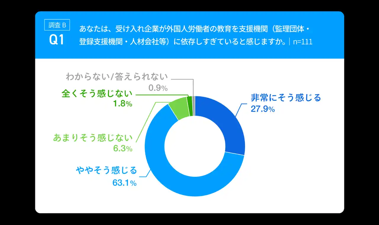 就労支援機関に対し、受け入れ企業が外国人労働者の教育を支援機関に依存しすぎていると感じるかを尋ねたところ、「非常にそう感じる」(27.9%)と「ややそう感じる」(63.1%)を合わせて91.0%が依存傾向を認識していることが判明しました。 |