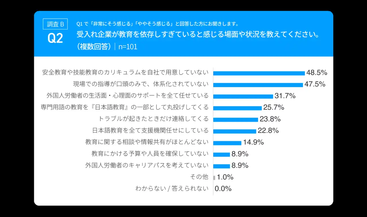 依存傾向を感じると回答した支援機関に対し、具体的にどのような場面や状況で依存を感じるかを尋ねたところ、「安全教育や技能教育のカリキュラムを自社で用意していない」(48.5%)、「現場での指導が口頭のみで、体系化されていない」(47.5%)、「外国人労働者の生活面・心理面のサポートを全て任せている」(31.7%)が上位に挙げられました。 |