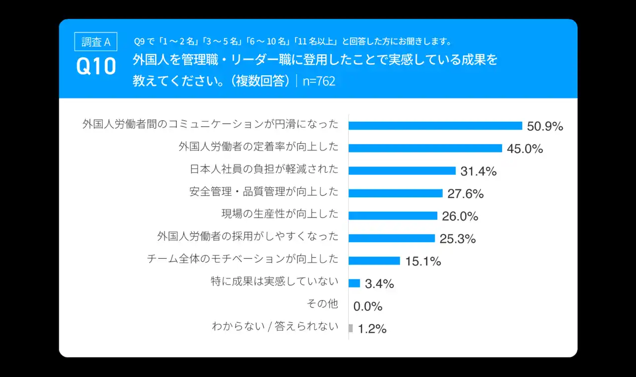 外国人労働者を管理職・リーダー職に登用したことで得られた成果を尋ねたところ、「外国人労働者間のコミュニケーションが円滑になった」「外国人労働者の定着率が向上した」が上位2項目として挙げられました。登用は単に組織体制の変化にとどまらず、現場のコミュニケーション改善と人材定着に直接的な効果をもたらしていることが示されています。 |