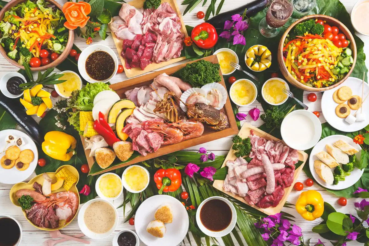 牛肩ロース、豚肩ロース 、やんばるハーブ鶏、片貝ホタテ、アルゼンチン産有頭赤海老、野菜(パプリカ、玉葱等)、焼きおにぎり、サラダ、カプレーゼ、ブロッコリーマリネ、もずく、ブルーシールアイスクリーム |