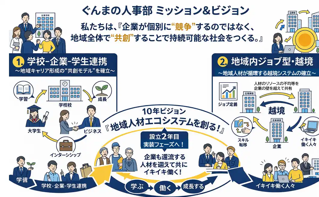 この度、一般社団法人ぐんまの人事部(代表理事:薗田直子)は、10年後の“地域人材エコシステム”の構築に向けて、新事業計画を策定しました。 |