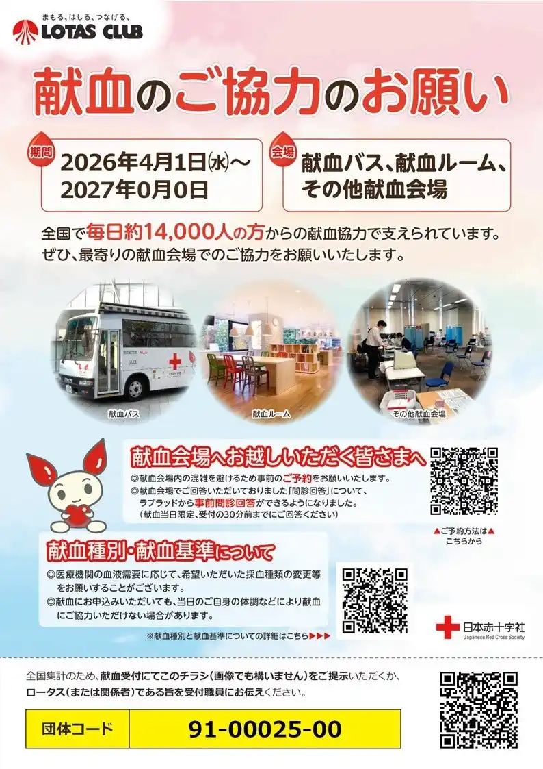 ロータス店で配布されたチラシをご持参いただく、または受付時に「ロータス」とお伝えいただき、お近くの献血ルーム等にて献血にご協力ください。 |