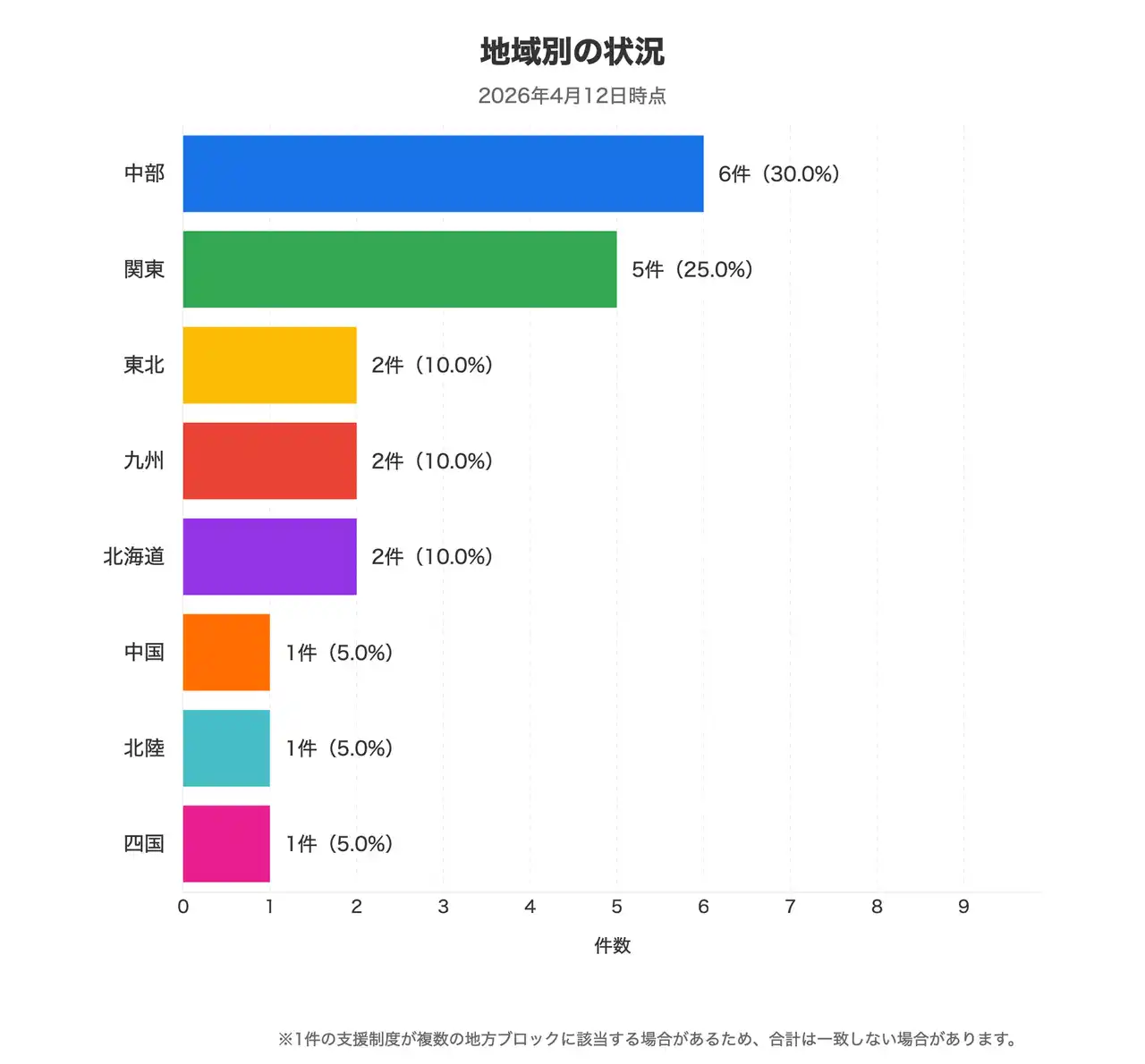 | 4月第2週の環境・省エネ関連支援は中部・関東に集中しており、この2ブロックで全20件のうち11件を占めています。 | ||||||||||||||||