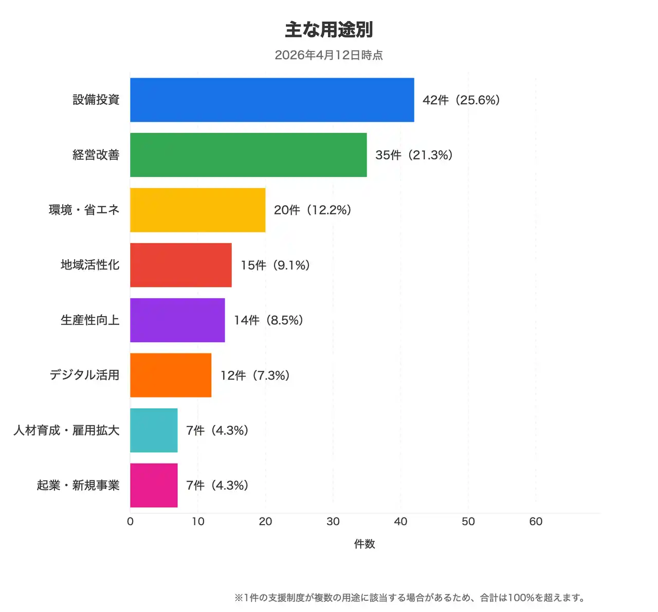 | 4月第2週の新着164件では設備投資と経営改善の支援が最多で、省エネ・脱炭素テーマの制度が全体の3番目に位置する構成です。 | ||||||||||||||||