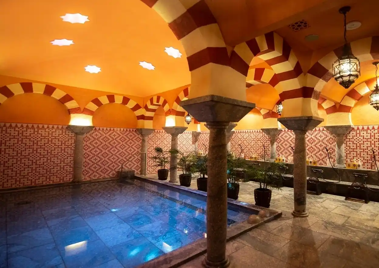 ムスリム統治時代のスペインをイメージしたアラビックデザインの天然温泉。スペインの世界遺産、コルドバのメスキータをイメージした浴場やモザイクの装飾で彩られたエキゾチックな内装は『スパ・アルハンブラ』最大の魅力です。アラビックな香りや音楽とともにお楽しみください。 |